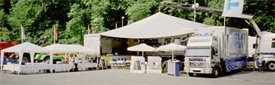 Durch verschiedene Anordnungsmöglichkeiten beim Einsatz mehrerer Module besteht die Möglichkeit einen wettergeschützten Atriumbereich zwischen den Modulen zu errichten. So können auf einer Grundfläche von knapp 100 qm, je nach Bestuhlung, bis zu 150 Personen wettergeschützt dem Redner auf der Bühne zuhören. Gleichzeitig, bzw. nach der Veranstaltung können in den einzelnen Modulen Fachgespräche geführt, bzw. ausgestellte Exponate besichtigt werden.