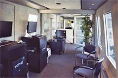 This module makes clear presentations possible with an effective area of scarcely 96 square meter.The internal area is coordinated as in all modules in yellow and blue coloured modern carpets which are suitable for allergy suffered persons. A kitchen with hotplates, fridge and microwave as well as a bathroom with toilet and wash basin are integrated. At the rear of the vehicle is a mounting plate incl. Motor control for satellite antennas. This technology originates from the professional range from TV Broadcasting-Trucks and makes possible also beside the SAT receipt also the transmission function.